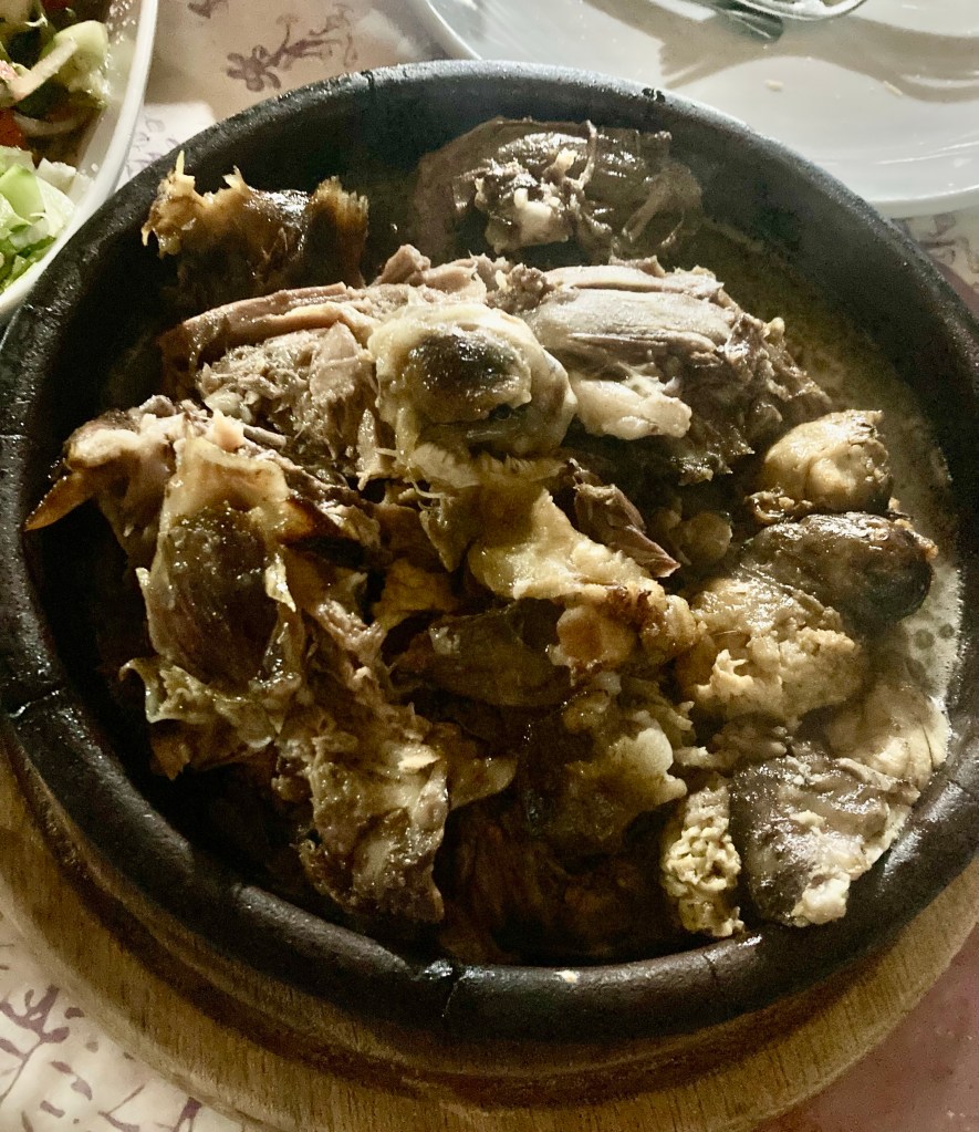 There’s no point being squeamish about this one. Restricting yourself to eating anonymous looking fillets or joints of meat is a bit of a cop out when there are so many other delicious parts of an animal to enjoy. A Middle Eastern speciality looked upon as a great delicacy, Kelle done well is a savoury mixture of flavours served in a hot skillet. At first glance it’s a jumble of dark meat until you begin to explore. Then you’ll find flaky tender cheek and head meat, firm tongue, delicate brain and the oft prized eyeballs. Served with a good Shepherds salad (Çoban salata), pickles (turşu) and fresh bread this is a sharing meal of distinction and one head will serve two people. When eating brain, the local way is to douse it with a good squeeze of fresh lemon and a dusting of black pepper.