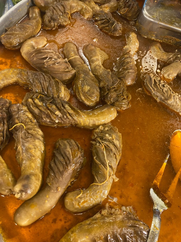 Mumbar are the rigorously cleaned intestines of a sheep, stuffed with a mixture of rice, tomato paste, minced meat, and spices. They really are delicious and worth a try. There isn’t a huge difference between this and a sausage.